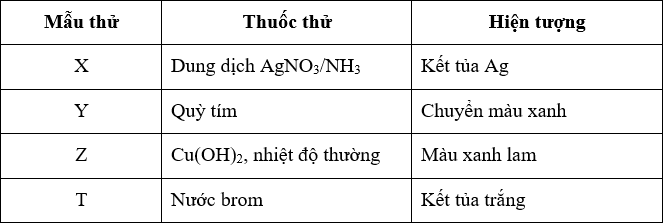 Kết quả thí nghiệm của dung dịch X, Y, Z, T với các thuốc thử được ghi như bảng sau: