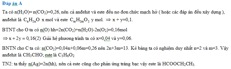 Đốt cháy hoàn toàn 0,1 mol hỗn hợp X gồm anđehit X và este Y, cần dùng vừa đủ 0,31 mol O2, thu được 5,824 lít CO2 ( đktc) và 4,68 gam H2O. Mặt khác, cho 0,05 mol M phản ứng với lượng dư dung dịch AgNO3 trong NH3, kết thúc các phản ứng thu được 10,8 gam Ag. Công thức cấu tạo thu gọn của X, Y lần lượt :