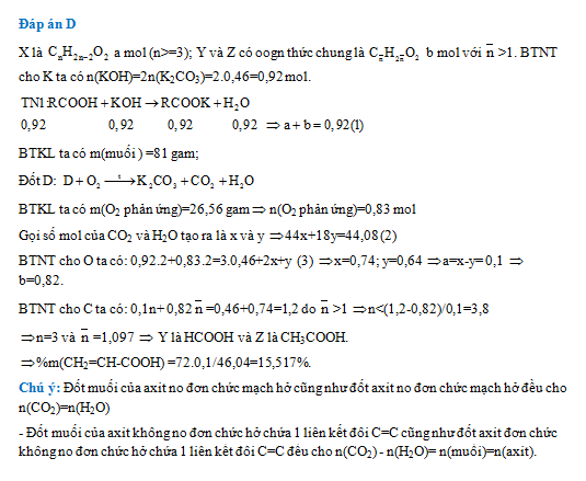 Hỗn hợp A gồm 3 axit hữu cơ X, Y ,Z đều đơn chức mạch hở, trong đó X là axit không no, có 1 liên kết đôi C=C; Y và Z là hai axit no đơn chức là đồng đẳng liên tiếp ( Mx < My). Cho 46,04 gam hỗn hợp A tác dụng với dung KOH vừa đủ, thu được dung dịch B. Cô cạn dung dịch B, thu được chất rắc khan D. Đốt cháy hoàn toàn D bằng O2 dư, thu được 63,48 gam K2CO3; 44,08 gam hỗn hợp CO2 và H2O. % khối lượng của X có trong hỗn hợp A có giá trị gần giá trị nào dưới đây nhất?