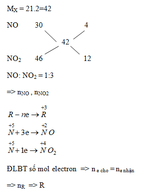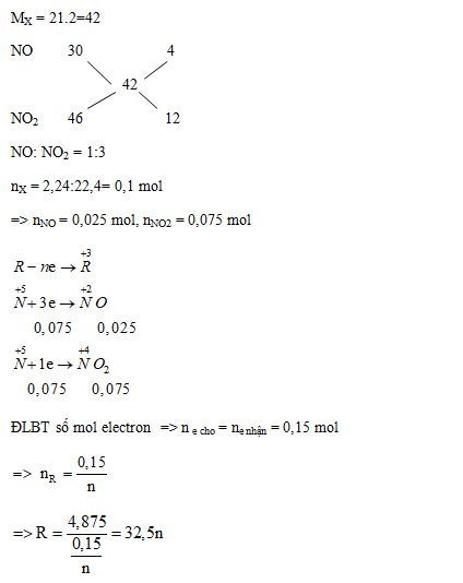 Hòa tan 4,875 gam một kim loại R bằng dung dịch HNO3 loãng dư thu được 2,24 lít hỗn hợp khí X gồm NO và NO2. Xác định tên của R, biết tỉ khối của X so với H2 bằng 21.