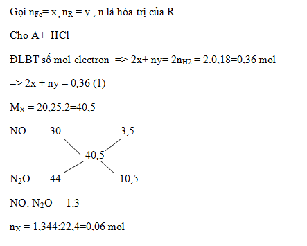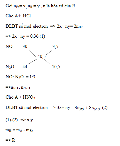 Hòa tan 4,95 gam hỗn hợp A gồm 2 kim loại Fe và R (có hóa trị không đổi) trong dung dịch HCl dư thu được 4,032 lít khí H2 (đktc). Mặt khác nếu cũng hòa tan một lượng hỗn hợp kim loại trên bằng dung dịch HNO3 dư thu được 1,344 lít hỗn hợp khí B gồm NO và N2O có tỉ khối hơi so với H2 bằng 20,25. Xác định R.