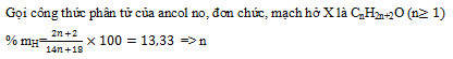 Trong công thức ancol no, đơn chức mạch hở X có phần trăm khối lượng hidro bằng 13,33%. Công