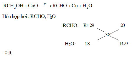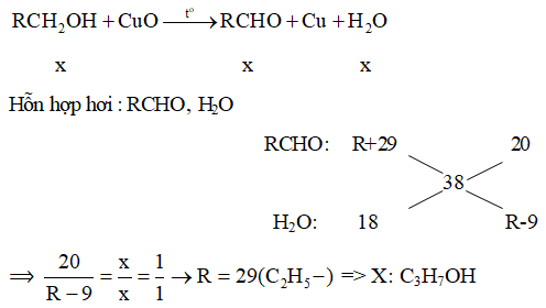 Cho m gam ancol đơn chức bậc 1 X qua ống đựng CuO dư nung nóng. Sau khi phản ứng xảy ra hoàn toàn ngoài chất rắn thu được hỗn hợp hơi gồm 2 chất có tỉ khối so với H2 là 19. Ancol X là: