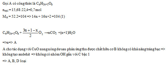 Đốt cháy hoàn toàn 0,1 mol ancol no A cần 15,68 lít O2 (đktc) biết tỉ khối hơi của A so với H2 bằng 52. Cho A cho tác dụng với CuO nung nóng dư sau phản ứng thu được chất hữu cơ B không có khả năng tráng bạC. Vậy A là: