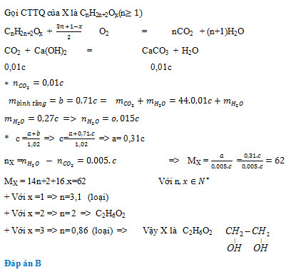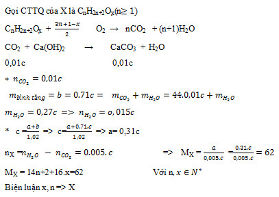 Đốt cháy hoàn toàn a(gam) chất hữu cơ X no chứa C,H,O sản phẩm thu được cho qua bình Ca(OH)2dư thấy khối lượng bình tăng b(gam) và có c (gam) kết tủa. Biết b=0,71c và \(c = \frac{{a + b}}{{1,02}}\) .Tìm X. Viết các công thức cấu tạo có thể có của X.