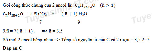 Đốt cháy hoàn toàn hỗn hợp rượu no, đơn chức , mạch hở, đồng đẳng thu được CO2 và H2O với tỉ lệ số mol tương ứng là 7:9. Biết số mol cả 2 ancol bằng nhau. Công thức phân tử của 2 ancol là