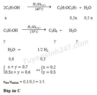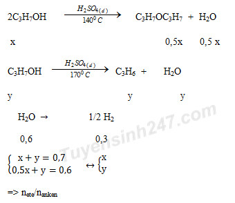 Đề hidrat hóa hoàn toàn 0,7 mol C3H7OH được hỗn hợp X ete, anken, H2O. Cho X tác dụng với Na dư thu được 0,3 mol H2. Ti lệ nete/nanken là