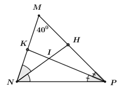 Cho \(\Delta MNP\) có \(\widehat{M}={{40}^{0}}\), các đường phân giác NH và PK của \(\widehat{N}\) và