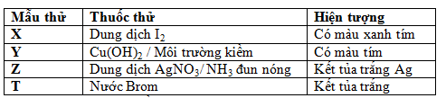 Thí nghiệm của các dung dịch X, Y, Z, T với các thuốc thử được ghi dưới bảng sau : Dung dịch