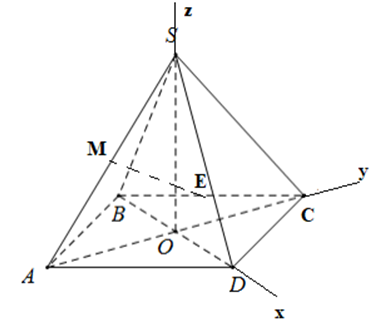 Cho hình chóp tứ giác đều \(S.ABCD\) có tất cả các cạnh bằng nhau. Gọi \(E,M\) lần lượt là