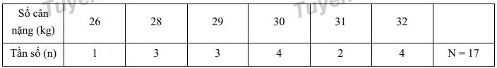 Số cân nặng của 17 học sinh nam (làm tròn đến kg) trong một lớp được ghi lại như