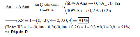 Ở một loài thực vật, gen A quy định quả đỏ trội hoàn toàn so với alen a quy định quả vàng. Lai cây thuần chủng lưỡng bội quả đỏ với cây lưỡng bội quả vàng được F1. Xử lý F1 bằng cônsixin, sau đó cho toàn bộ F1 này giao phấn ngẫu nhiên với nhau được F2. Giả thiết rằng thể tứ bội chỉ tạo ra giao tử lưỡng bội, khả năng sống và thụ tinh của các loại giao tử là ngang nhau, hợp tử phát triển bình thường và hiệu quả việc xử lí hoá chất cônsixin gây đột biến lên F1 đạt tỉ lệ thành công là 60%. Theo lý thuyết, tỉ lệ kiểu hình quả đỏ ở F2 là: