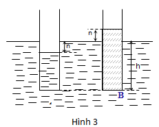 Hai cốc thuỷ tinh giống hệt nhau, vỏ rất mỏng, có diện tích đáy SA = SB = S = 20 cm2 và trọng lượng PA= PB = P, một cốc chứa nước và một cốc chứa dầu. Khi đặt cả hai cốc vào bể nước thì đáy cốc và mực chất lỏng trong cốc đều cách mặt nước trong bể tương ứng là h và n (Hình 3)