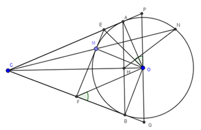Cho đường tròn tâm O bán kính R. Từ điểm C nằm ngoài đường tròn kẻ hai tiếp tuyến CA, CB và cát tuyến CMN với đường tròn (O) (A, B là hai tiếp điểm, M là điểm nằm giữa C và N). Gọi H là giao điểm của CO và AB