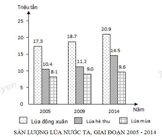 Nhận xét nào sau đây không đúng về sản lượng lúa nước ta giai đoạn 2005 - 2014?