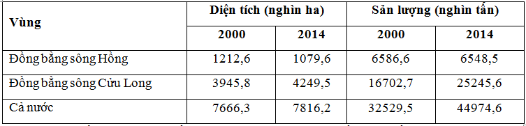 Cho bảng số liệu: DIỆN TÍCH VÀ SẢN LƯỢNG LÚA CỦA CẢ NƯỚC, ĐỒNG BẰNG SÔNG HỒNG VÀ