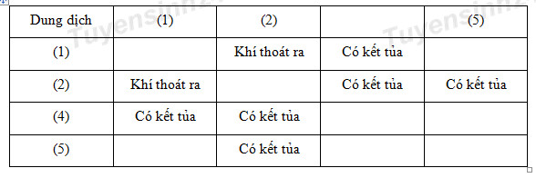 Các dung dịch riêng biệt: Na2CO3, BaCl2, FeCl2, H2SO4, NaOH được đánh số ngẫu nhiên (1), (2), (3), (4), (5). Tiến hành một số thí nghiệm, kết quả ghi lại trong bảng sau: