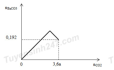 Cho m gam hỗn hợp X gồm Ba, BaO, Ba(OH)2 có cùng số mol vào nước, thu được 500 ml dung dịch Y và a mol H2. Hấp thụ từ từ 3,6a mol CO2 vào 500 ml dung dịch Y, kết quả thí nghiệm được biểu diễn bằng đồ thị sau:
