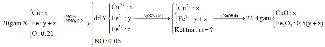Hòa tan hết 20 gam hỗn hợp X gồm Cu và các oxit sắt (trong hỗn hợp X oxi chiếm 16,8% về khối lượng) cần vừa đủ dung dịch hỗn hợp A chứa b mol HCl và 0,2 mol HNO3 thu được 1,344 lít NO (đktc) là sản phẩm khử duy nhất và dung dịch Y. Cho dung dịch Y tác dụng với một lượng AgNO3 vừa đủ thu được m gam kết tủa và dung dịch Z. Cho Z tác dụng với một lượng dư dung dịch NaOH, lọc kết tủa, nung đến khối lượng không đổi thu được 22,4 gam chất rắn. Các phản ứng xảy ra hoàn toàn. Giá trị của m là