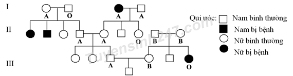 Cho sơ đồ phả hệ mô tả sự di truyền của một bệnh ở người do một trong hai alen của một gen quy định. Một gen khác gồm 3 alen qui định nhóm máu ABO nằm ở một nhóm gen liên kết khác. Biết rằng không xảy ra đột biến ở tất cả các cá thể trong phả hệ.