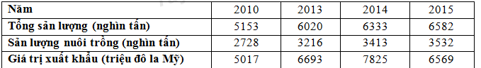 Đê thể hiện sản lượng và giá trị xuất khẩu thủy sản của nước ta giai đoạn 2010 – 2015 theo bảng số liệu, biểu đồ nào sau đây là thích hợp nhất?