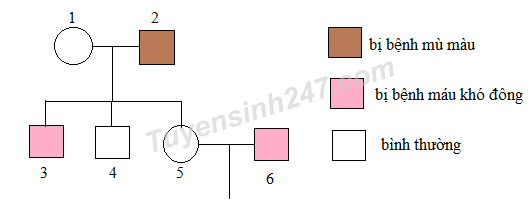 Ở người, alen A quy định kiểu hình bình thường trội hoàn toàn so với alen a quy định bệnh mù màu, alen B quy định kiểu hình bình thường trội hoàn toàn so với alen b quy định máu khó đông. Hai gen này nằm trên vùng không tương đồng của nhiễm sắc thể × và cách nhau 20 cM. Theo dõi sự di truyền hai tính trạng này trong một gia đinh thấy: người phụ nữ (1) có kiểu gen dị hợp tử chéo kết hôn với người đàn ông (2) bị bệnh mù màu sinh con trai (3) bị bệnh máu khó đông, con trai (4) và con gái (5) không bị bệnh. Con gái (5) kết hôn với người đàn ông (6) bị bệnh máu khó đông. Biết rằng không xảy ra đột biến mới ở tất cả mọi người trong gia đình trên. Trong các kết luận sau, có bao nhiêu kết luận đúng?