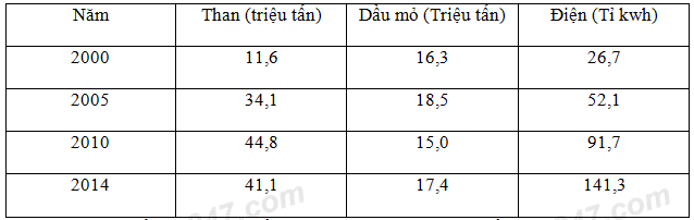 Cho bảng số liệu: Sản lượng than, dầu thô và điện của nước ta giai đoạn 2000 –