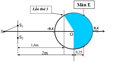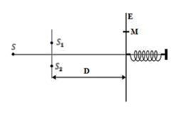 Thí nghiệm giao thoa Iâng với ánh sáng đơn sắc có bước sóng 0,6 m,μkhoảng cách giữa hai khe S1, S2 là 1mm. Màn quan sát E gắn với một lò xo và có thể dao động điều hòa dọc theo trục đối xứng của hệ. Ban đầu màn E ở vị trí cân bằng là vị trí mà lò xo không biến dạng, lúc này khoảng cách từ mặt phẳng chứa hai khe đến màn quan sát E là D = 2m. Truyền cho màn E vận tốc ban đầu hướng ra xa mặt phẳng chứa hai khe để màn dao động điều hòa theo phương ngang với biên độ A = 40 cm và chu kì T = 2,4 s. Tính thời gian ngắn nhất kể từ lúc màn E dao động đến khi điểm M trên màn cách vân trung tâm 5,4 mm cho vân sáng lần thứ ba?
