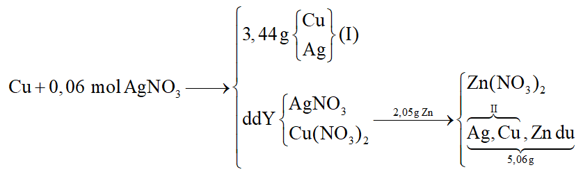 Cho m gam bột Cu vào 300 ml dung dịch AgNO3 0,2M, sau một thời gian thu được 3,44 gam chất rắn X và dung dịch Y. Cho 2,05 gam Zn vào dung dịch Y đến phản ứng hoàn toàn, thu được 5,06 gam chất rắn Z và dung dịch chứa 1 muối duy nhất. Giá trị của m là