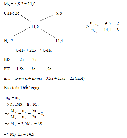 Hỗn hợp X gồm C2H2 và H2, có tỉ khối so với H2 bằng 5,8. Dẫn X (đktc) qua bột Ni nung nóng cho đến khi các phản ứng xảy ra hoàn toàn, thu được hỗn hợp Y. Tỉ khối của Y so với H2 là