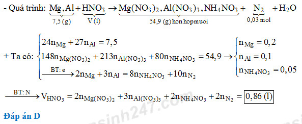 Hòa tan hoàn toàn 7,5 gam hỗn hợp gồm Mg và Al bằng lượng vừa đủ V lít dung dịch HNO3 1M. Sau