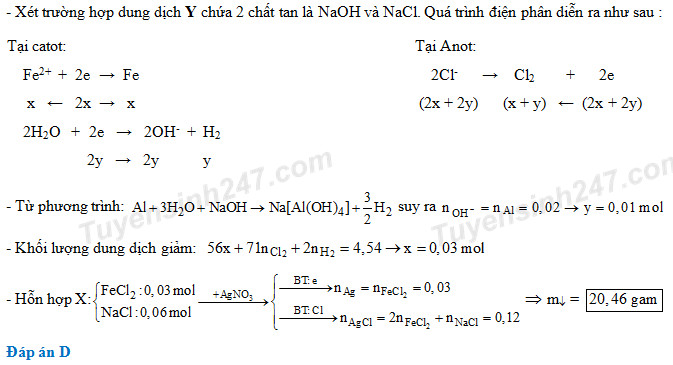 Điện phân dung dịch X gồm FeCl2 và NaCl (tỉ lệ mol tương ứng là 1 : 2) với điện cực trơ màng
