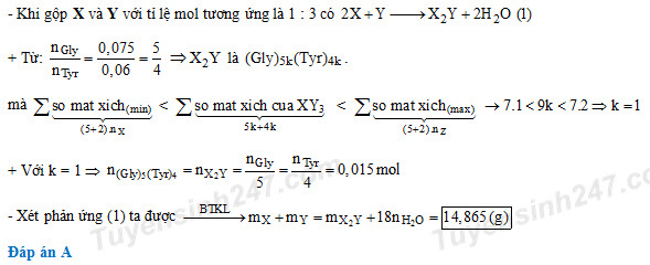 Hỗn hợp A gồm một peptit X và một peptit Y (mỗi chất được cấu tạo từ 1 loại aminoaxit, tổng số nhóm -CO-NH- trong 2 loại phân tử là 5) với tỉ lệ số mol nX : nY = 2 : 1. Khi thủy phân hoàn toàn m gam hỗn hợp A thu được 5,625 gam glyxin và 10,86 gam tyrosin. Giá trị của m là: