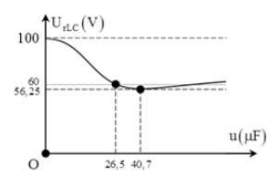 Đoạn mạch mắc nối tiếp theo thứ tự gồm điện trở R, cuộn dây có điện trở r và tụ điện có điện dung thay đổi được. Đặt vào hai đầu đoạn mạch một điện áp xoay chiều có tần số 50 Hz. Đồ thị hình bên mô tả mối quan hệ của điện áp hiệu dụng URLCgiữa hai đầu đoạn mạch chứa cuộn dây và tụ điện theo điện dung. Điện trở r có giá trị gần nhất với giá trị nào sau đây ?