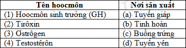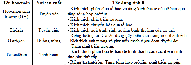 Bảng sau cho biết nơi sản xuất của một số hoocmôn ảnh hưởng đến sinh trưởng và phát