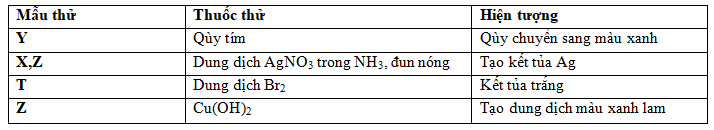 Tiến hành thí nghiệm với các dung dịch X, Y, Z, và T. Kết quả được ghi ở bảng sau; X, Y, Z, T