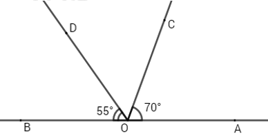 Cho góc bẹt \(\widehat{AOB}\), trên cùng một nửa mặt phẳng có bờ AB, vẽ các tia OC và OD sao cho \(\widehat{AOC}={{70}^{0}},\widehat{BOD}={{55}^{0}}\)