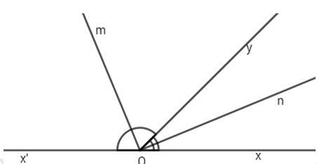 Cho \(\widehat{xOy}\), On là tia phân giác. Kẻ tia Ox’ là tia đối của tia Ox, Om là phân giác của \(\widehat{x'Oy}\) . Tính \(\widehat{mOn}\) .