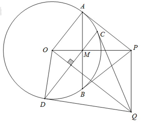 Từ điểm P ngoài đường tròn (O) kẻ hai tiếp tuyến PA, PHÂN BIỆT với đường tròn (A, B là hai tiếp điểm). Gọi M là giao điểm của OP và AB. Kẻ dây cung CD đi qua M (CD không đi qua O và CD không trùng với AB). Hai tiếp tuyến của đường tròn (O) tại C và D cắt nhau tại Q. Chứng minh rằng OP vuông góc PQ