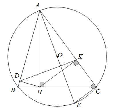 Cho tam giác ABC nội tiếp đường tròn (O;R) với đường cao \(AH=R\sqrt{2}\). Gọi D, K lần lượt là hình chiếu của H lên AB và AC. Chứng minh rằng \({{S}_{ADK}}=\frac{1}{2}{{S}_{ABC}}\), (với \({{S}_{ADK}};{{S}_{ABC}}\) lần lượt là diện tích của hai tam giác ADK và ABC)