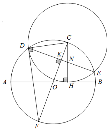 Cho đường tròn (O) đường kính AB. Từ một điểm C thuộc đường tròn (O) kẻ CH vuông góc với AB (C khác A và B; H thuộc AB). Đường tròn tâm C bán kính CH cắt đường tròn (O) tại D và E. Gọi N là giao điểm của DE và CH. Chứng minh rằng N là trung điểm CH.