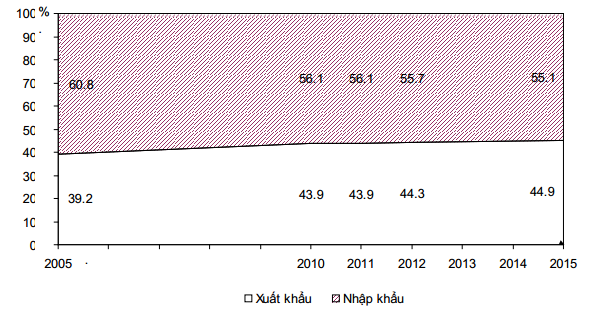 => Biểu đồ đã cho thể hiện Sự chuyển dịch cơ cấu giá trị xuất nhập khẩu của Hoa Kì giai đoạn 2005 - 2015.
