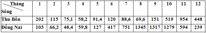 Cho bảng số liệu: LƯU LƯỢNG NƯỚC TRUNG BÌNH TRÊN SÔNG THU BỒN VÀ SÔNG ĐỒNG NAI (đơn vị: