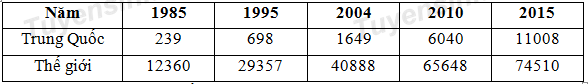 Cho bảng số liệu: GDP CỦA TRUNG QUỐC VÀ THẾ GIỚI QUA CÁC NĂM (Đơn vị: tỉ USD) Nhận xét nào