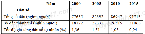 Cho bảng số liệu: TÌNH HÌNH PHÁT TRIỂN DÂN SỐ CỦA NƯỚC TA GIAI ĐOẠN 2000 - 2015 (Nguồn: Niên