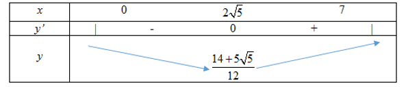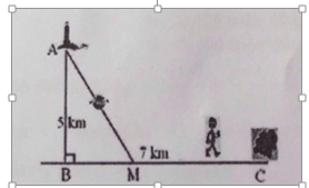 Một ngọn hải đăng đặt tại vị trí A có khoảng cách đến bờ biển\(AB=5km\). Trên bờ biển có một cái kho ở vị trí C cách B một khoảng \(7km\). Người canh hải đăng có thể chèo đò từ A đến M trên bờ biển với vận tốc \(4km/h\) rồi đi bộ đến C với vận tốc \(6km/h\). Vị trí của điểm M cách B một khoảng bao nhiêu để người đó đi đến kho nhanh nhất?