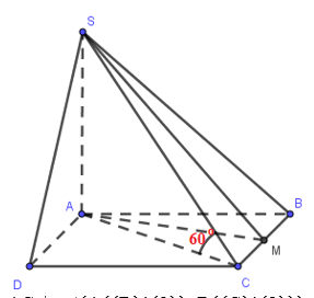 Cho hình chóp S.ABCD có đáy ABCD là hình chữ nhật, \(AB=2a,\,\,BC=a,\,\,SA\) vuông góc với mặt phẳng đáy và M là trung điểm của BC, góc giữa đường thẳng SC và mặt phẳng đáy bằng \({{60}^{0}}\). Góc giữa SM và mặt phẳng đáy có giá trị gần với giá trị nào nhất sau đây: