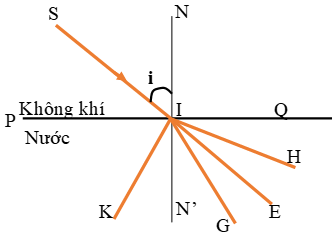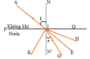 Cho hình vẽ, SI là tia tới. Tia khúc xạ của tia này trùng với một trong số các đường IH, IE, IG, IK. Tia khúc xạ của tia tới SI là: