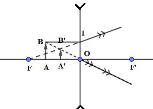 Đặt vật AB trước một thấu kính phân kì có tiêu cự 12cm. Vật AB cách thấu kính một khoảng \(d=8cm\), A nằm trên trục chính.