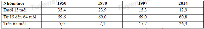 Dựa vào bảng số liệu trên, cho biết nhận xét nào sau đây không đúng với đặc điểm dân số Nhật Bản giai đoạn 1950 -2014?